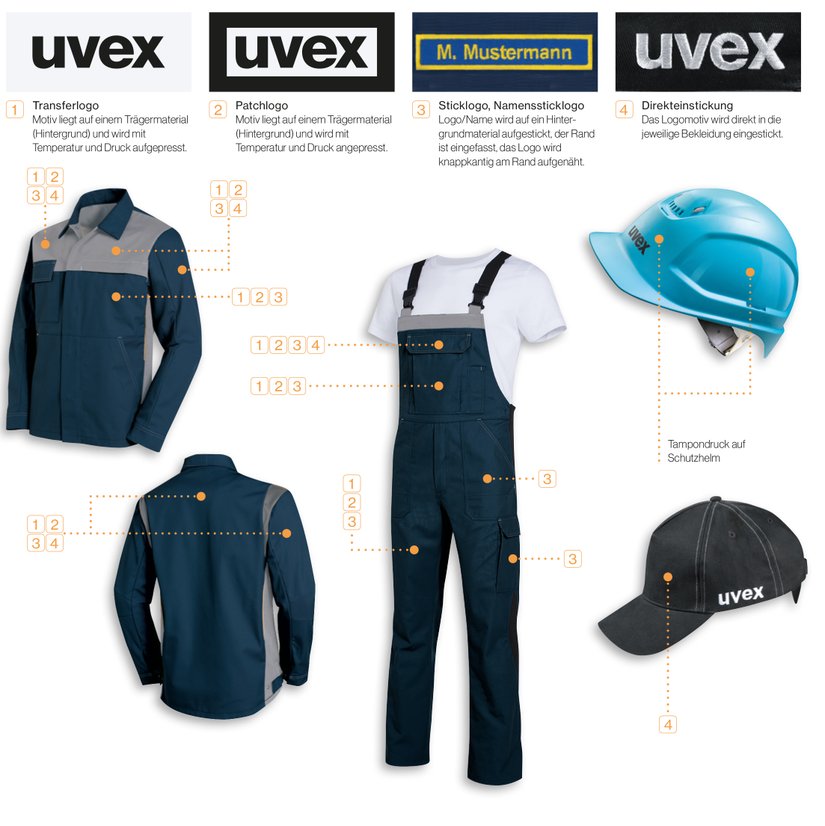 Koruyucu kıyafetlerimizin ve iş kıyafetlerimizin ihtiyaçlarınıza mükemmel şekilde uyduğundan emin olmak için size ürünlerinizi uvex add-on ile kendi logolarınızla ve amblemlerinizle özelleştirme ya da ek özellikler ekleme seçeneği sunuyoruz.